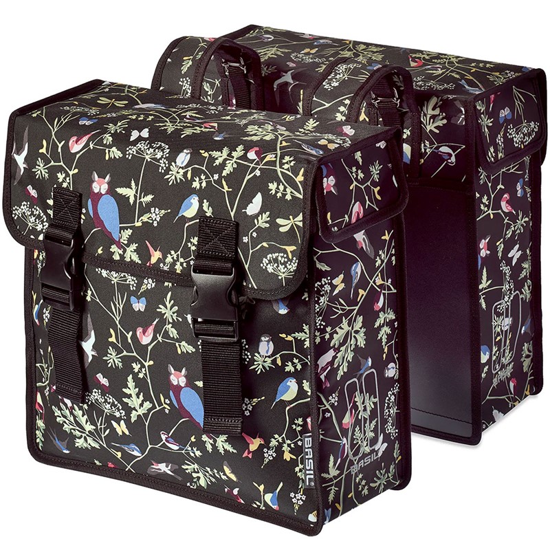 Basil Wanderlust Double Bag crna je dvostruka biciklistička torba ukrašena razigranim motivom ptica koja donosi spoj praktičnosti i stila.